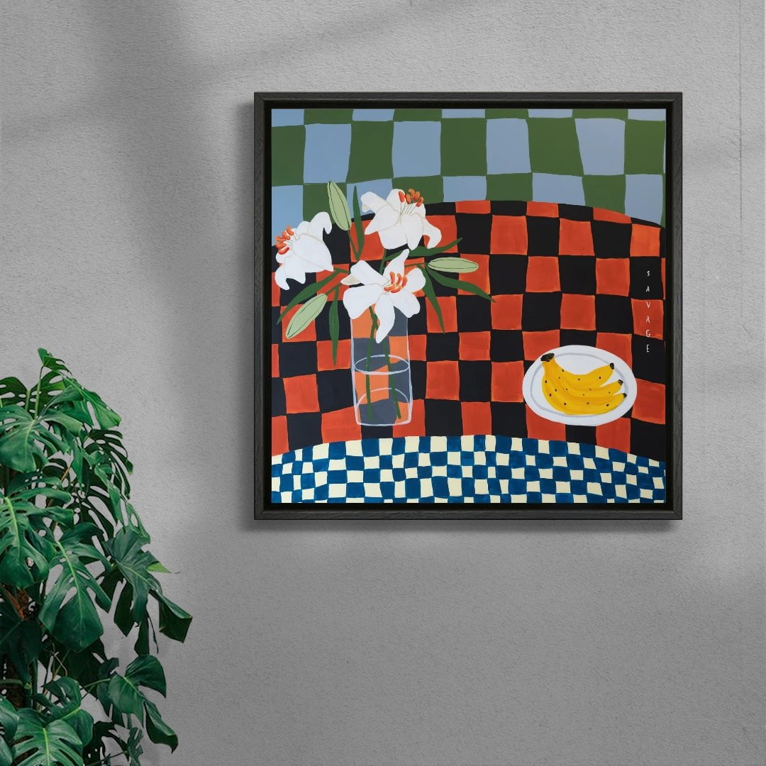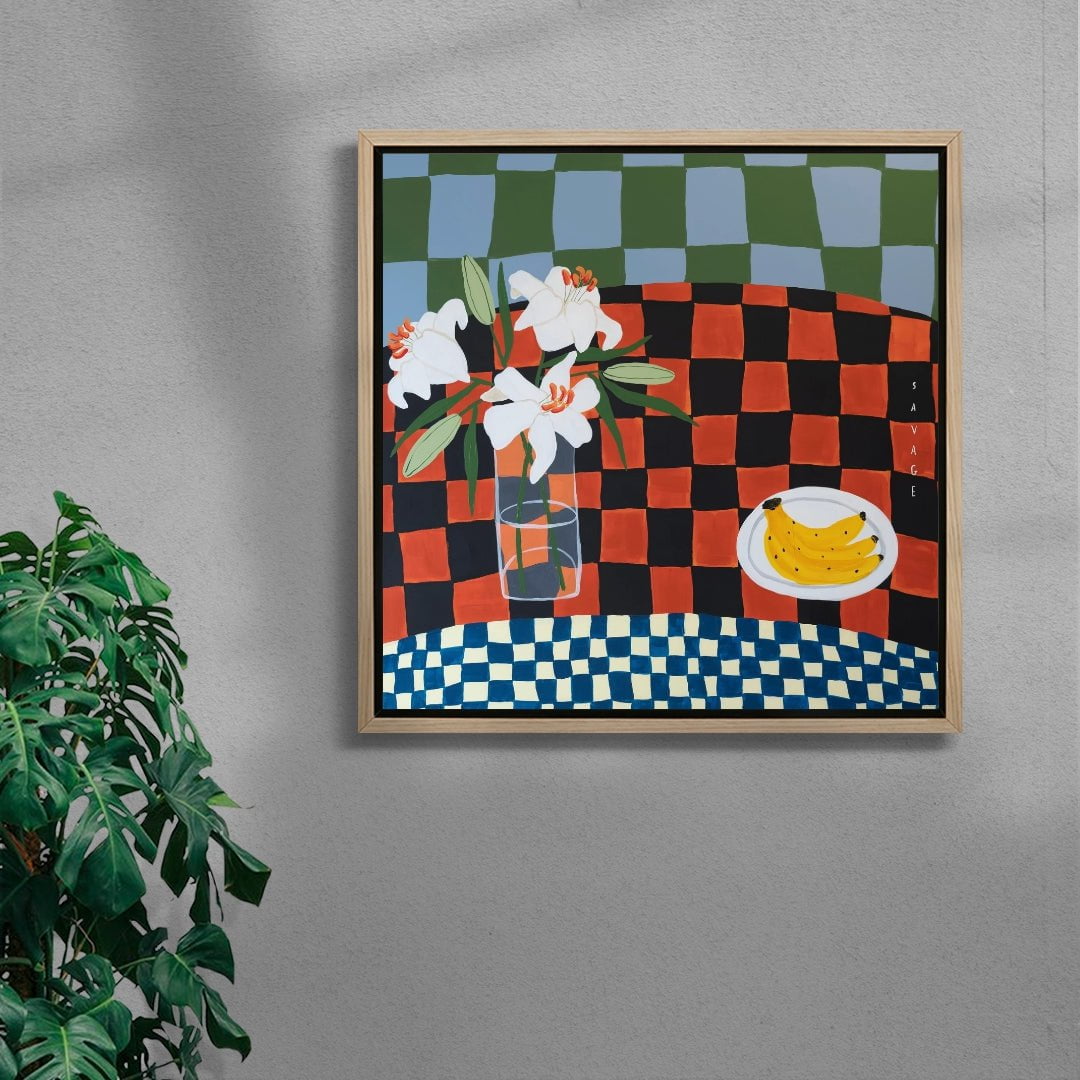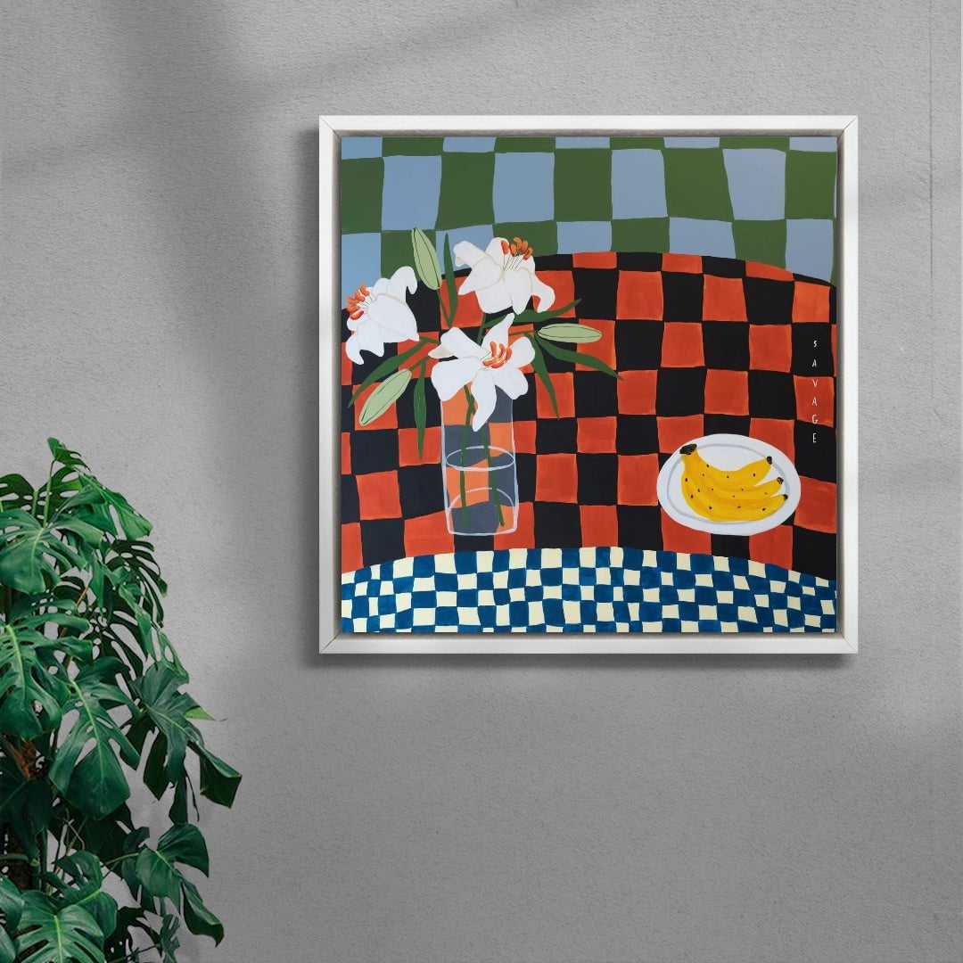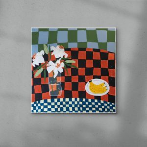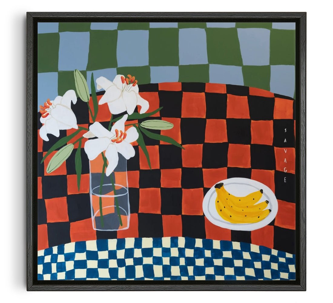 Natalie Savage is a London based painter who’s work is inspired by good food. friends. and the tables we find ourselves around enjoying these things. Predominantly still life. Natalie’s work is filled with bold colour and playfulness that bring a pop of fun to the area they are put in.